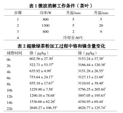 血[6];過(guò)量的鎳可引起炎癥、癌癥、癥、系統紊亂、降低生育能力、致畸和致突變等[7];鉻雖是人體必需的微量元素,但高鉻的食用也會(huì )引起不適[8]。超微綠茶粉是將達到綠色標準的綠茶茶葉,經(jīng)超微粉碎形成 200 目(74μm)甚至達到 1000 目(12μm)以上的綠茶超微細粉[9-10]?,F階段我國企業(yè)大多采用球磨方式加工超微綠茶粉,在球磨加工過(guò)程中,茶葉被粉碎的同時(shí),研磨材料本身也會(huì )發(fā)生變化,從而可能給超微綠茶粉帶來(lái)重金屬污染。另外,與傳統茶葉不同的是,超微綠茶粉屬于茶葉深加工范疇,常被以全組分形式加入到食品和化妝品中[11],又因其中的重金屬元素應滿(mǎn)足《食品標準食品中污染物限量》和《茶葉中鉻、鎘、汞、砷及氟化物限量》對茶葉中重金屬限量要求[12-13],因此應對超微綠茶粉加工過(guò)程中重金屬污染給予關(guān)注,但目前對超微綠茶粉加工過(guò)程中的重金屬含量變化未見(jiàn)報道。本文對球磨加工過(guò)程中超微綠茶粉的重金屬含量進(jìn)行檢測分析,同時(shí),采用三組球磨材料不銹鋼球-不銹鋼罐、氧化鋯球-不銹鋼罐、瑪瑙球-尼龍罐對超微綠茶粉進(jìn)行加工,通過(guò)重金屬元素鉻和鎳的檢測,并結合粒徑分析,為尋找合適的球磨材料提供依據。