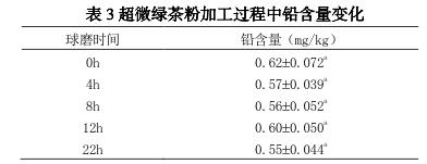 超微綠茶粉中的鉛并無(wú)顯著(zhù)差異。原因為在球磨加工過(guò)程中,茶樣處于密閉空間中,且所接觸的球磨材料中鉛,所以在超微綠茶粉的加工過(guò)程中,并不會(huì )造成鉛污染。