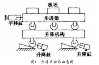 500機組加熱爐目前采用的是推鋼式出鋼,此種方式容易產(chǎn)生黑印、 粘鋼等弊端, 嚴重影響鋼材軋制的質(zhì)量, 應改為目前為常用的步進(jìn)梁出鋼方式。 步進(jìn)梁式系統具有技術(shù)成熟、 出鋼高效等點(diǎn), 其動(dòng)作方式如圖1所示: