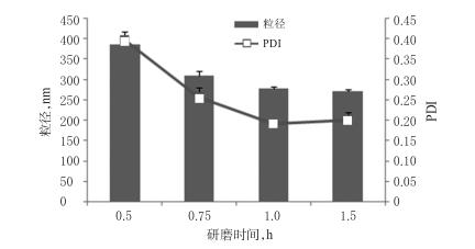 2.1.3研磨時(shí)間的篩選稱(chēng)取BRE原料藥7.5g,置于含有吐溫80(1.125g)的水溶液(22.5mL)中,攪拌混懸,加入氧化鋯珠(粒徑為0.6mm)450g,分別研磨0.5、0.75、1.0、1.5h,制備3批BRE納米晶混懸液。以BRE納米晶混懸液的粒徑、PDI為指標,篩選研磨時(shí)間。結果,隨著(zhù)研磨時(shí)間的延長(cháng),BRE納米晶混懸液的粒徑、PDI逐漸減??;研磨0.5、0.75、1.0h時(shí),BRE納米晶混懸液的粒徑、PDI減小的幅度較大;研磨1.5h時(shí),BRE納米晶混懸液粒徑雖然較研磨1.0h時(shí)的粒徑減小,但減小幅度不大。綜合考慮能耗和時(shí)間,確定研磨時(shí)間為1h。研磨時(shí)間的篩選結果見(jiàn)圖3。